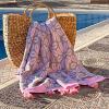 Maak je gebruik van een strandbed? Dan is onze populaire beachbed cover Three Palms een ideale oplossing. Deze stranddoek sla je eenvoudig om het hoofdeinde van het strandbed, waardoor de doek niet wegwaait.