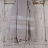 Deze hamamdoeken hebben een ander dessin dan de classic hamamdoeken van Ottomania. Ze hebben een lengte van 200 x 100 cm. Ideaal voor bijvoorbeeld op een strandstoel of strandbed waarmee je deze in het geheel kan bedekken. Ondanks zijn lengte zijn deze extra lange hamamdoeken nog steeds lekker licht en klein opvouwbaar. De Ottomania hamamdoek in de kleur grijs-beige is gemaakt van hydrofiel katoen waardoor deze zeer goed vocht opneemt. Deze lichtgewicht hamamdoek is ideaal als strandhanddoek, voor op reis, voor op de boot, voor naar het zwembad, de sportschool of de sauna. Al onze hamamdoeken worden geweven op een "black loom" weefmachine. Dit is een weefgetouw dat half automatisch is. Het is een ambacht die van familie op familie gaat. De kwastjes worden door de vrouwen met de hand gedraaid en geknoopt. Een echte Turkse ambacht waar men zeer trots op is en wat je nog echt handwerk mag noemen. Kleur en gewicht verschillen en/of weeffoutjes horen bij het product. Dit doet niks af aan de kwaliteit van de hamamdoek.