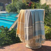 Ga je naar het strand of het zwembad, dan mag een hamamdoek of strandlaken gerust wat groter zijn. Een formaat van 100 x 180 cm is praktisch en comfortabel. Wil je liever met je hele lichaam languit op de doek liggen, dan raden wij een hamamdoek van 100 x 200 cm aan.
